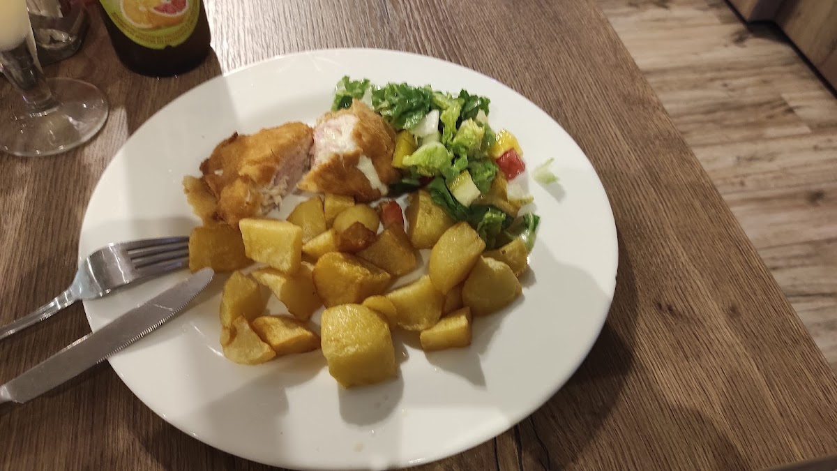 Beyond coffee, the menu discreetly nods to heartier fare with a highlighted dish like Gorden Blue So Zemiakmi (Cordon Bleu with potatoes), suggesting this cafe pulls double duty as both a light eatery and a casual lunch spot. It’s likely a place where workers or neighbors might stop in around midday to switch from coffee to something more filling without fuss.